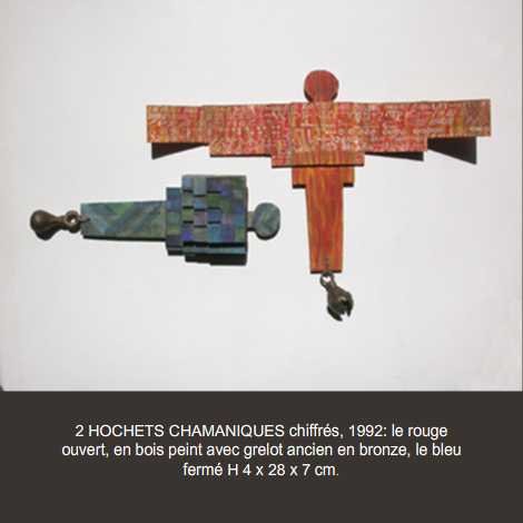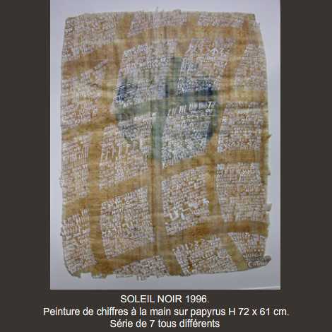 Petit à petit des séries de chiffres ‘1234567’ ont remplacé les séries de sculptures en 7 éléments qui, souvent à échelle humaine, devenaient difficiles à stocker en atelier. J‘ai commencé ces écritures, par jeu, sur des hochets chamaniques de ma fabrication qui accompagnaient mes incantations intérieures (voir l’installation/parcours INCANTARE). Puis j’ai écrit ces chiffres sur des bois incurvés à chaud, puis sur des papyrus. C’est alors que j’ai eu envie de les écrire sur des tissus. Le tissu nous accompagne de la naissance jusqu’à la mort. J’ai découvert un autre avantage à ce travail: une exposition ‘Tissus et Vidéos’ sur 500m² se transporte dans une valise de 20 kg.
